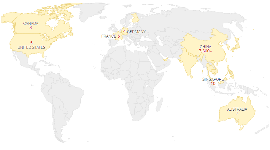 Tính đến sáng ngày 30/01/2019, Virus Corona được phát hiện tại ít nhất 18 quốc gia, hầu hết đều có liên quan đến việc di chuyển qua Trung Quốc.